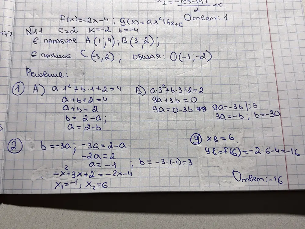 На рисунке изображены графики функций \(f\left(x\right)=-2x-4\) и \(g\left(x\right)=ax^2+bx+c\), которые пересекаются в точках А и В. Найдите ординату точки В.