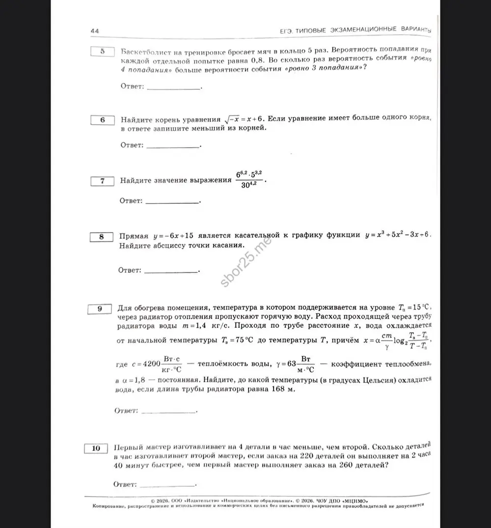 Для обогрева помещения, температура в котором поддерживается на уровне \(T_п=15 °C\), через радиатор отопления пропускают горячую воду. Расход проходящей через трубу радиатора воды \(m=1{,}4\, кг/с\). Проходя по трубе расстояние \(x\), вода охлаждается от начальной температуры \(T_в=75 °C\) до температуры \(T\), причём \(x=\alpha\dfrac{cm}{γ}\log_{2}{\frac{T_в-T_п}{T-T_п}}\), где \(c=4200\,\dfrac{Вт\cdot с}{кг\cdot °C}\) - теплоёмкость воды, \(γ=63\,\dfrac{Вт}{м\cdot °C}\) - коэффициент теплообмена, а \(\alpha=1{,}8\) - постоянная. Найдите, до какой температуры (в градусах Цельсия) охладится вода, если длина трубы радиатора равна 168 м.