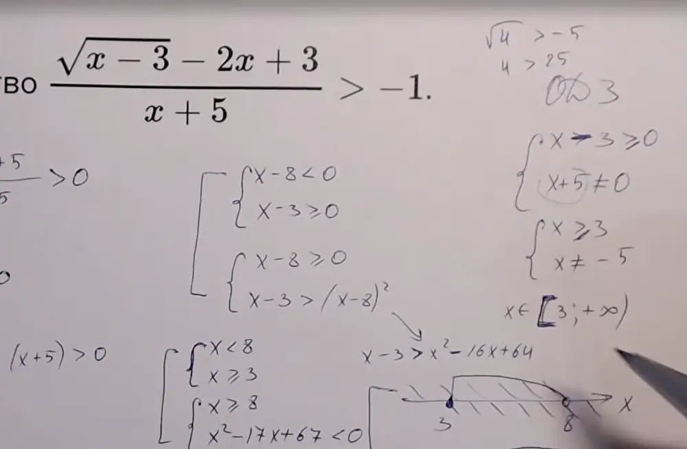 Решите неравенство \(\dfrac{\sqrt{x-3}-2x+3}{x+5}>-1\).