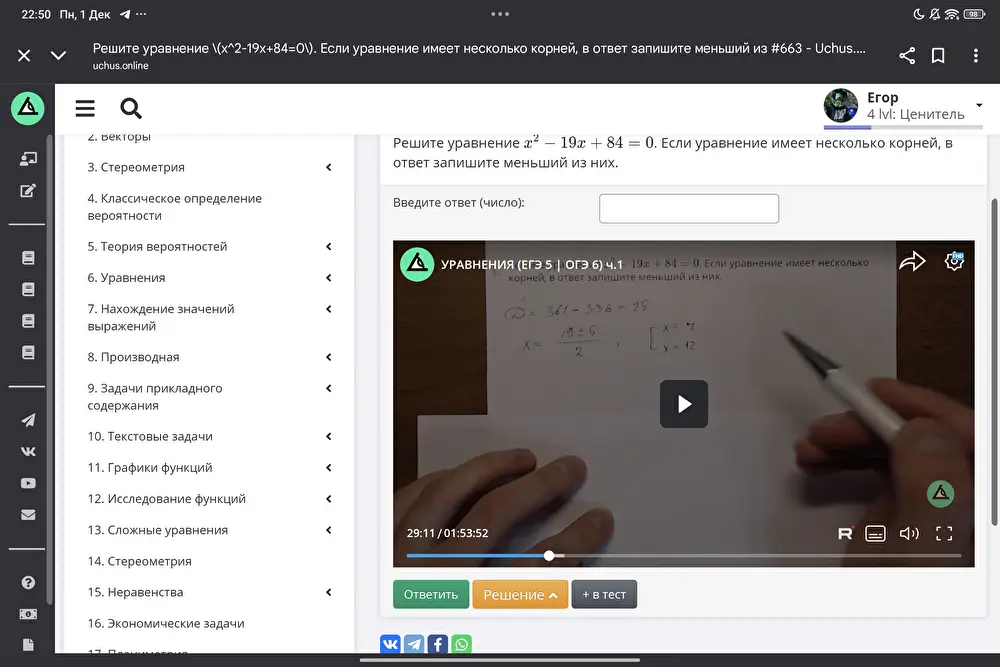 Решите уравнение \(x^2-19x+84=0\). Если уравнение имеет несколько корней, в ответ запишите меньший из них.