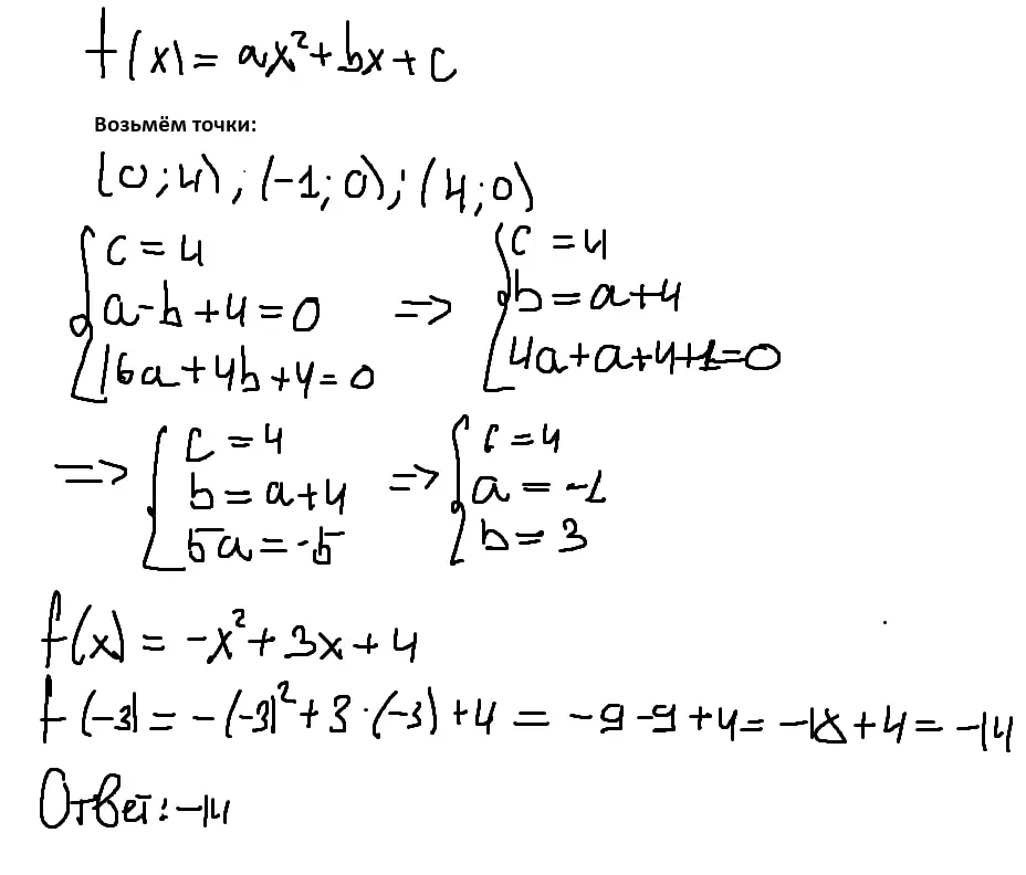На рисунке изображен график функции \(f(x)=ax^2+bx+c\). Найдите \(f(-3)\)