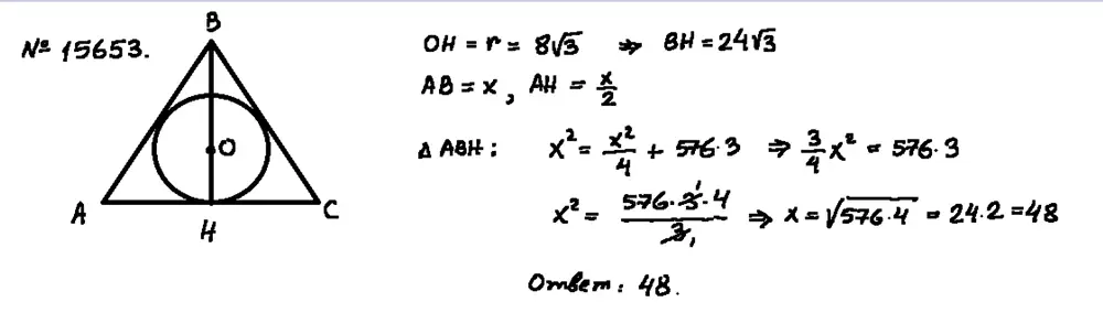 Радиус окружности, вписанной в равносторонний треугольник, равен \(8\sqrt{3}.\) Найдите длину стороны этого треугольника.