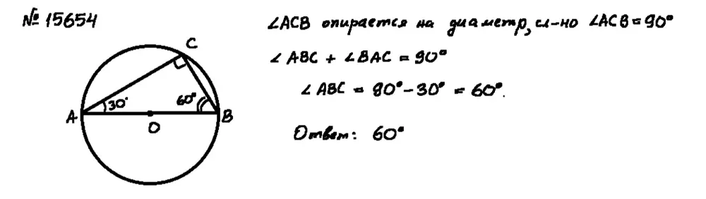 Центр окружности, описанной около треугольника \(ABC,\) лежит на стороне \(AB.\) Найдите угол \(ABC,\) если угол \(BAC\) равен \(30°.\) Ответ дайте в градусах.