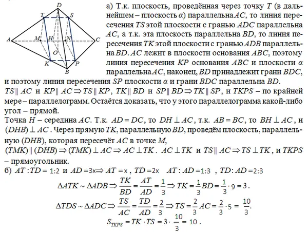 В основании правильной треугольной пирамиды ABCD лежит треугольник ABC со стороной, равной 5. Боковое ребро пирамиды равно 9. На ребре AD отмечена точка T так, что AT:TD=1:2. Через точку T параллельно прямым AC и BD проведена плоскость.