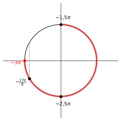 Отметим границы отрезка и корни на окружности. Отрезок идет от \(-3\pi\) до \(-1{,}5\pi\) против часовой стрелки (от крайней левой точки круга, делаем полный оборот назад и останавливаемся в верхней точке).