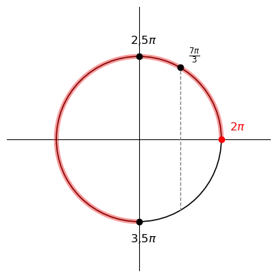 Отметим отрезок на окружности. Он начинается в точке \(2\pi\) (крайняя правая) и идет против часовой стрелки на три четверти круга до точки \(3{,}5\pi\) (нижняя точка).