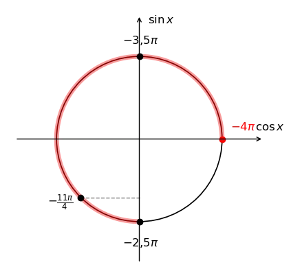 Отметим границы отрезка на окружности. Идем от точки \(-4\pi\) (крайняя правая) против часовой стрелки до точки \(-2{,}5\pi\) (нижняя точка). Дуга проходит через три четверти круга.