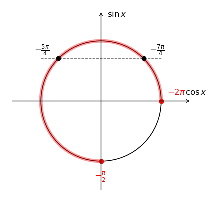 Отметим границы отрезка. Идем от \(-2\pi\) (крайняя правая точка) против часовой стрелки до \(-0{,}5\pi\) (нижняя точка). Дуга охватывает I, II и III четверти.