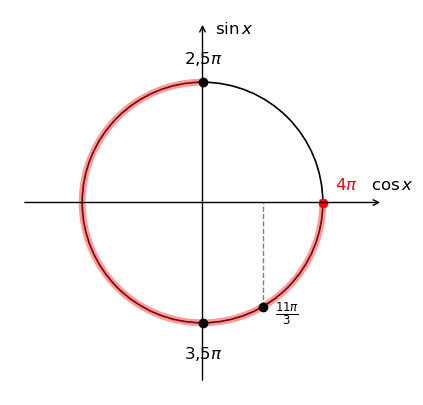 Серия \( x = \frac{\pi}{2} + \pi n \): При \( n = 2 \): \( x = 2{,}5\pi \). Входит (граница). При \( n = 3 \): \( x = 3{,}5\pi \). Входит. Серия \( x = \pm\frac{\pi}{3} + 2\pi k \): При \( k = 2 \): \( x = 4\pi - \frac{\pi}{3} = \frac{11\pi}{3} \) (или \( 3\frac{2}{3}\pi \)). Входит. Точка \( 4\pi + \frac{\pi}{3} \) больше границы, а точки на предыдущем витке меньше \( 2{,}5\pi \).