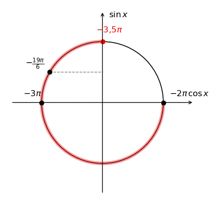 Отметим границы отрезка на окружности. Идем от точки \(-3{,}5\pi\) (верхняя точка) до точки \(-2\pi\) (крайняя правая) против часовой стрелки. Дуга охватывает II, III и IV четверти.
