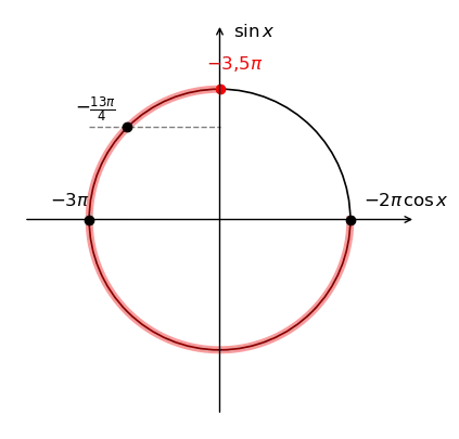 Отметим границы отрезка на окружности. Точка \(-3{,}5\pi\) (или \(-\frac{7\pi}{2}\)) находится вверху. Двигаемся против часовой стрелки до точки \(-2\pi\) (крайняя правая). Дуга проходит через II, III и IV четверти.