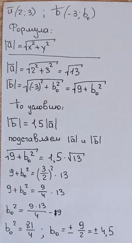 Даны векторы \(\vec{a}(2;3)\) и \(\vec{b}(-3;b_0)\). Найдите \(b_0\), если \(|\vec{b}|=1{,}5|\vec{a}|\). Если таких значений несколько, в ответ запишите меньшее из них.